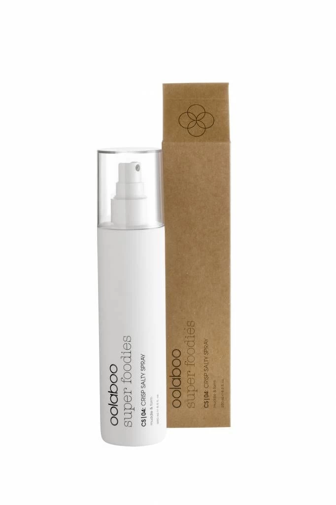 De Oolaboo Super Foodies Crisp Salty Spray 250ml is een textuurspray die licht van gewicht is. De spray bevat zeezoutkristallen, wat het haar een matte finish geeft met een medium hold. Na gebruik krijgt het haar direct meer textuur en volume. Het haar wordt niet plakkerig.